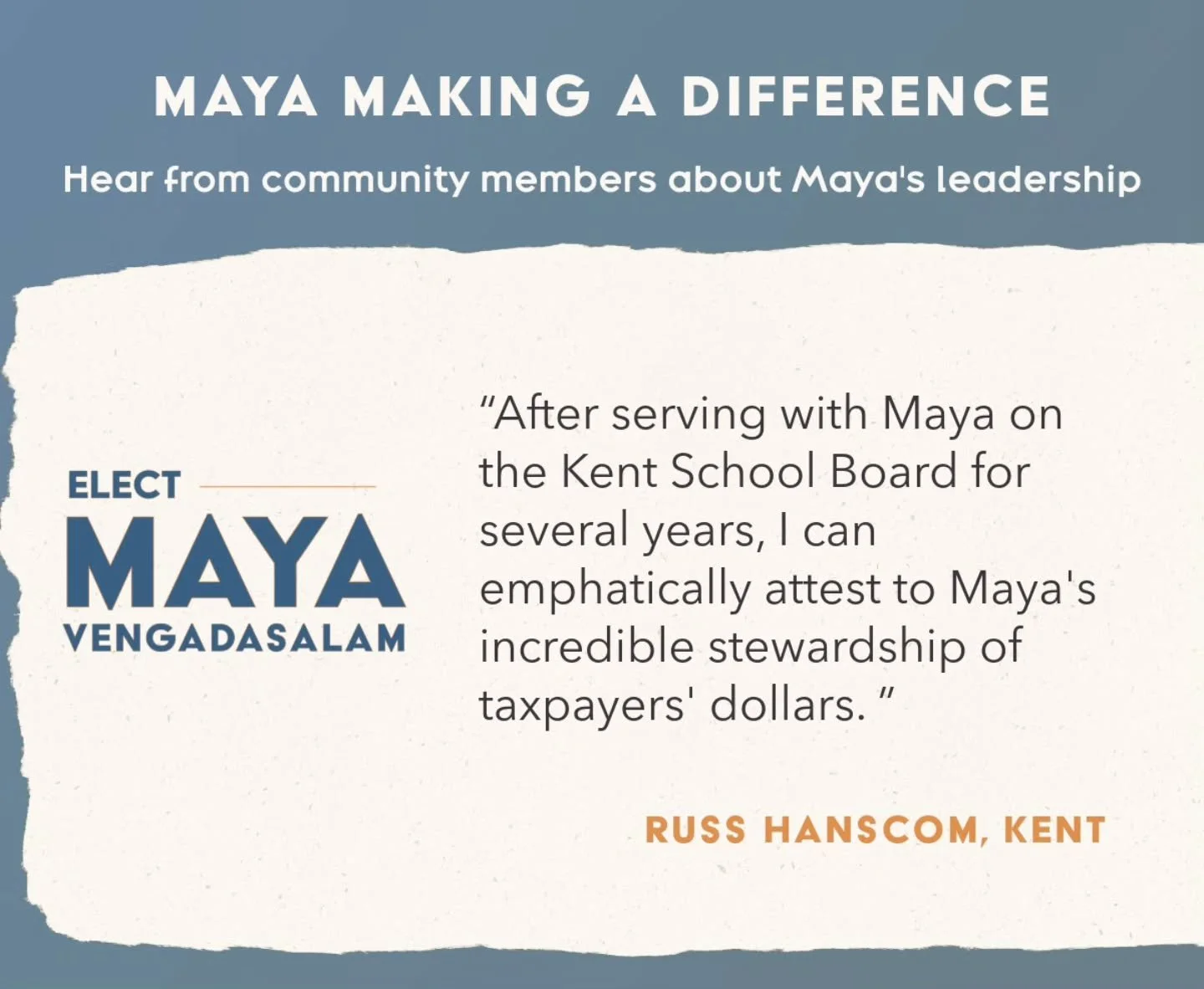 I’m running to make King County more responsive, more transparent and more inclusive. My campaign is about change, and my promise to address the concerns facing our communities every day. I respectfully ask for your vote so we can move forward to a new future.”~ Maya