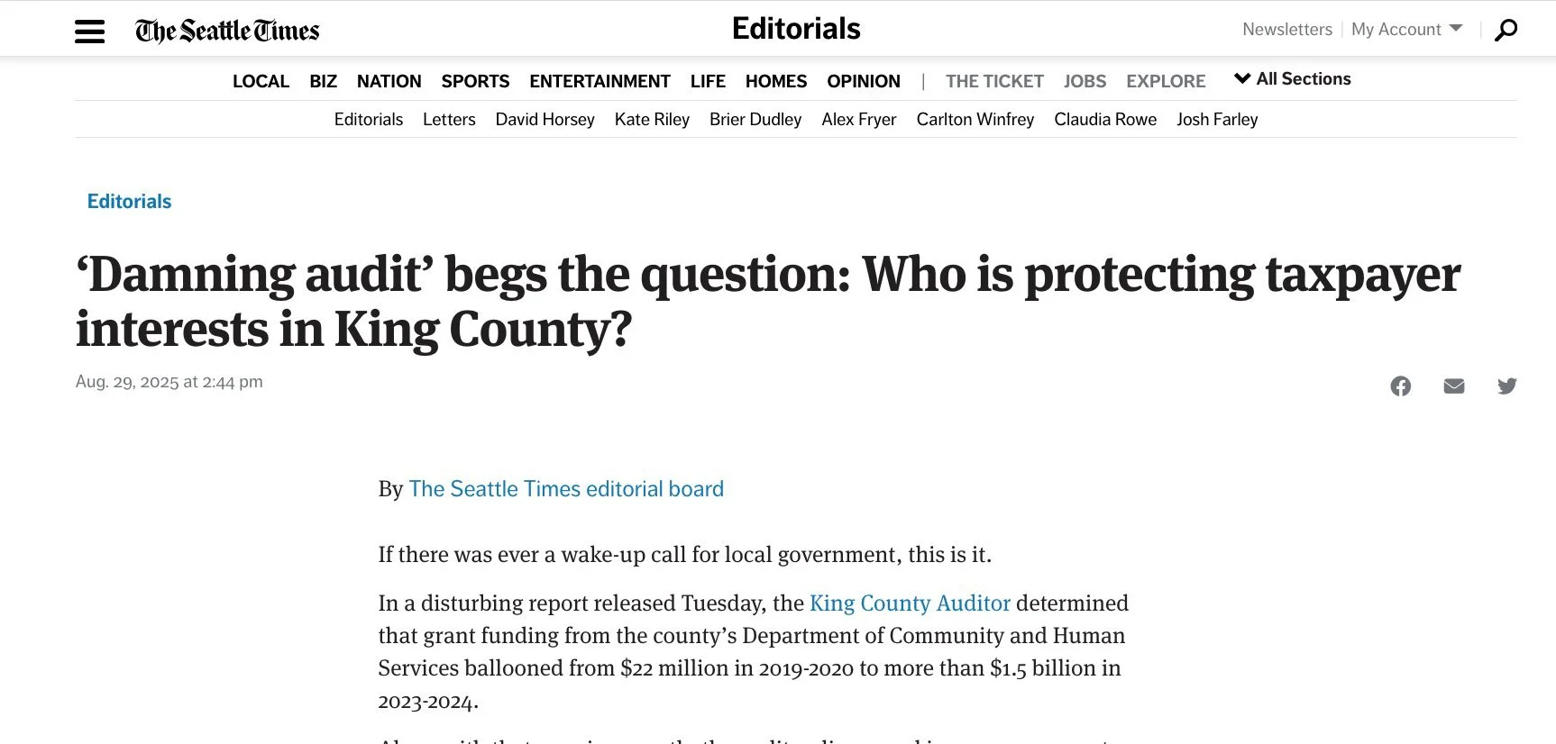 King County faces a looming budget shortfall, with a projected $160-180 million deficit in the general fund for the 2026-2027 biennium. This structural gap is caused by state laws that limit property tax revenue growth. On top of this, a recent audit found potential fraud and improper payments in community grants from the Department of Community and Human Services, which has grown to over $1.5 billion in grants in 2023 and 2024. The audit noted a lack of internal controls and oversight.